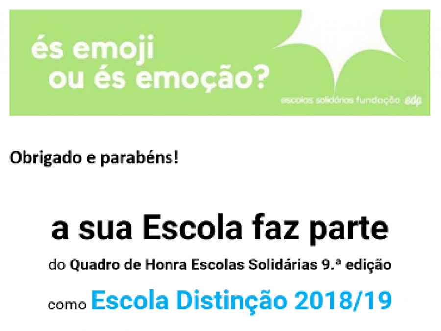 Obrigado e parabéns!a sua Escola faz parte do Quadro de Honra Escolas Solidárias 9.ª edição como Escola Distinção 2018/19Este ano letivo foram mais de 510 escolas , de todos os distritos do país, que como a sua, responderam ao desafio Escolas Solidárias e...