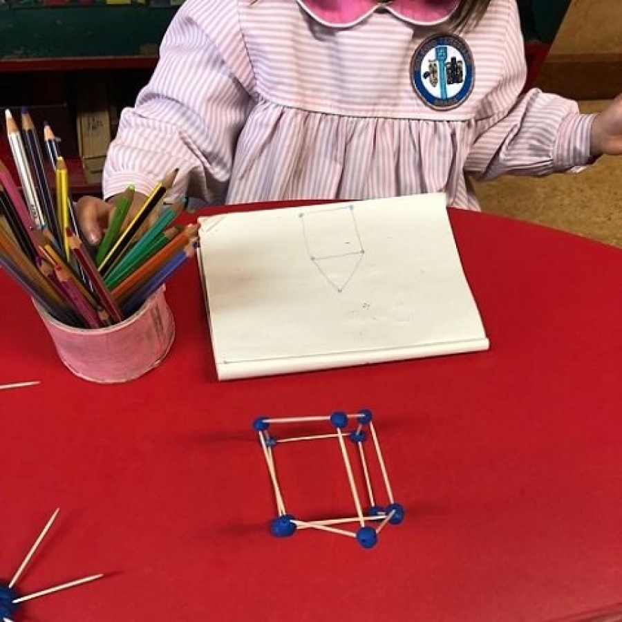 Atividade realizada na sala dos 5 anos, turma B: utilizando, apenas, dois materiais (plasticina e palitos), cada criança realizou a sua construção 3D, registando, através de desenho, o que construíram .